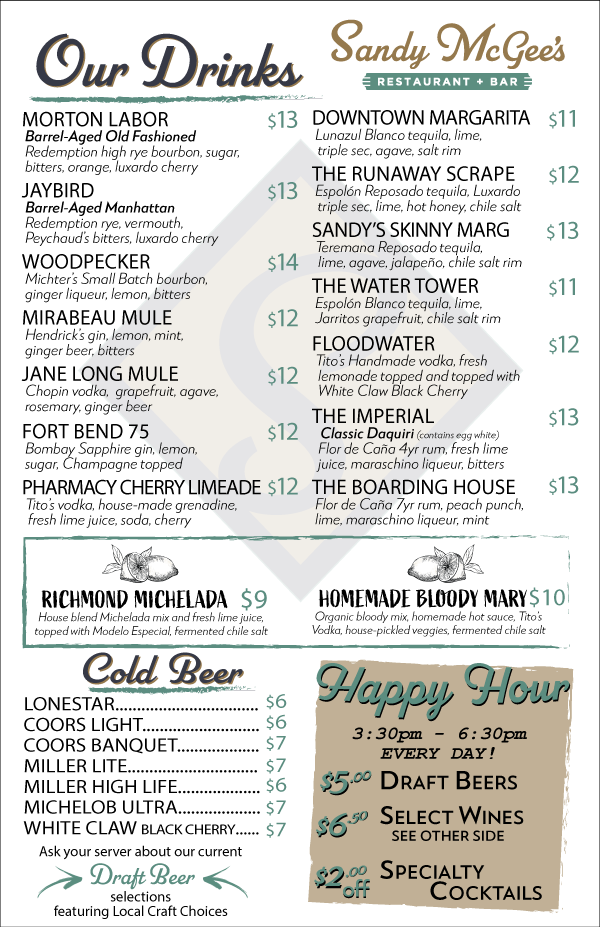 Our specialty cocktails are crafted with attention to the smallest detail. From barrel-aged whiskeys to house-pickled veggies and hand-made glassware, our drinks stand up to Sandy McGee’s long-standing reputation for quality and perfection.